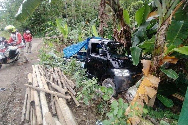 Sebuah Daihatsu Gran Max nyungsep hajar pohon pisang setelah mesin mobil diduga mati saat turunan. Kene terluka kena minyk goreng