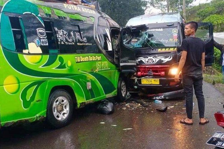 Dua unit Mitsubishi FE 71 jurusan Bungbulang-Bandung adu tebas di kebun teh Cisandaan, Pamulihan, Garut hingga ambyar dan pengemudi terjepit