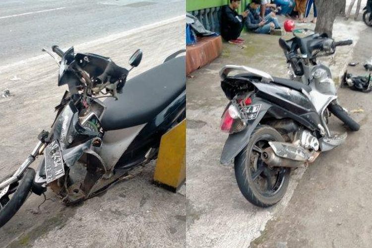 Yamaha Mio J hancur jadi korban tabrak lari, disenggol mobil yang disalipnya, pontang-panting disambut dump truck di Nguter, Sukoharjo