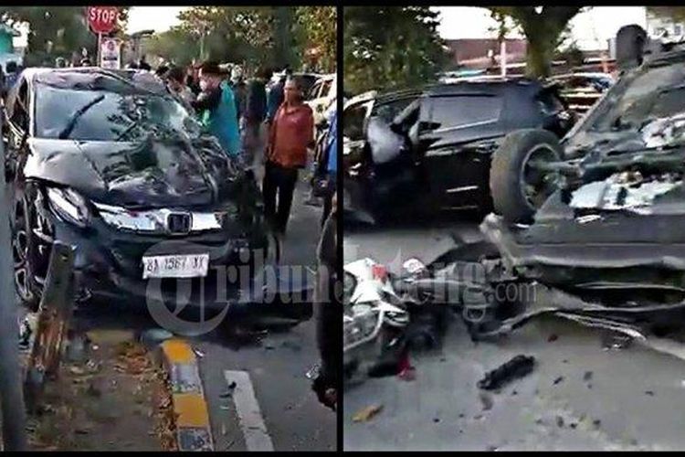 Honda HR-V pelat putih babak belur, kayang hingga bodi ringsek usai terjang Mitsubishi Mirage dan dua motor di kota Padang, Sumatera Barat