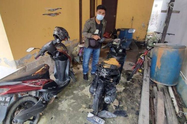 Satu Kawasaki Ninja dan dua Yamaha Mio dirembeti api dalam kondisi terparkir di depn rumah. Menurut dugaan dibakar orang tak dikenal