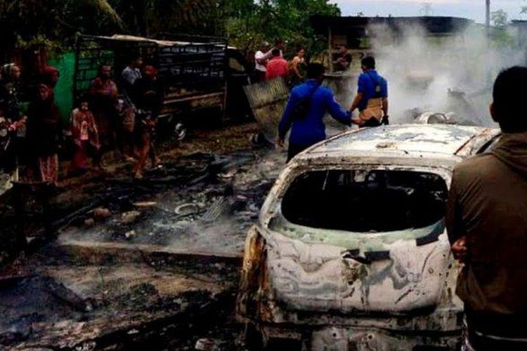Daihatsu Gran Max dan diduga Ayla melepuh bersama lima motor habis, kena sambar api kebakaran rumah panggung di Sajoanging