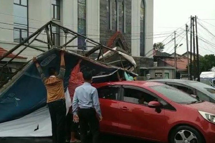 KIA Rio, Honda Jazz dan satu mobil ketiban apes, parkir di sebuah ban atap ringsek, kejatuhan baliho ambruk di kota Tasikmalaya