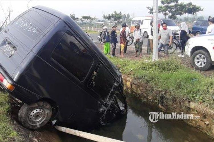 Suzuki Futura nungging di selokan, kabin depan remuk kecelup comberan di desa Nambakor, Saronggi, Sumenep, Madura