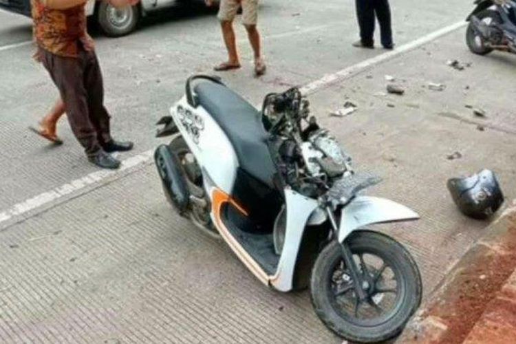 Sebuah Honda Scoopy ringsek parah setelah dibawa dua renaja yang asyik rekam truk oleng. Namun tak sadar depannya ada truk