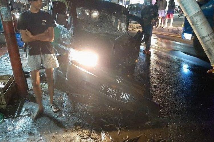 Suzuki Carry hajar tiang usai maksa nyalip dari lajur kiri, ikan lele tercecer di aspal, separuh kabin hancur tak berbentuk