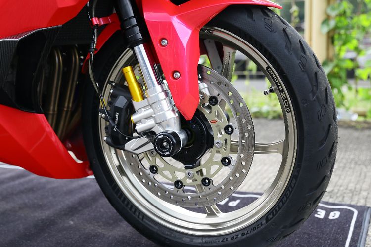 Kawasaki Ninja ZX-25R punya kaki-kaki kekar dengan rem depan berkaliper radial 4 piston untuk mengawal piringan semi-floating 310 mm