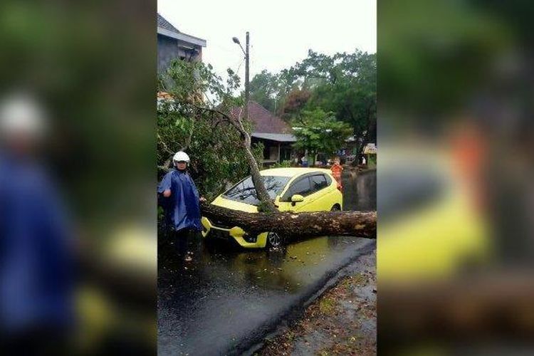 Honda Jazz GK5 dipalang pohon di tengah jalan, pengemudi panik, ambruk serempet kap mesin dan fender depan kiri di Ciamis