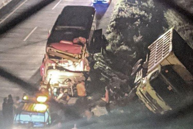 Bus PO Sugeng Rahayu babak belur wajah setelah menabrak bak belakang truk di Tol Semarang-Solo. Satu penumpang luka berat