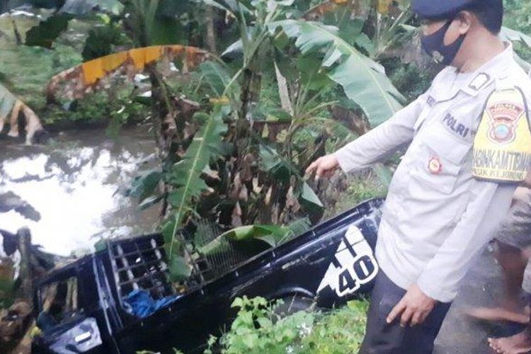 Mitsubishi L300 nyangkut di koloni pohon pisang, nyaris tercebur kolam ikan dengan posisi tegak di Purbalingga
