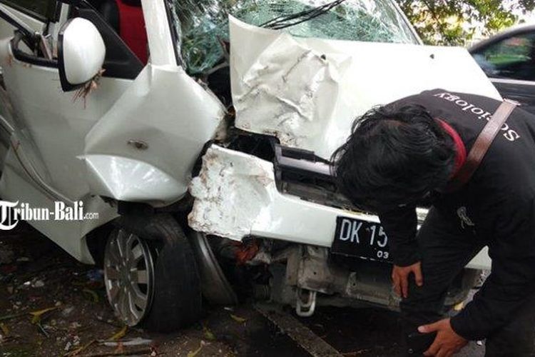 Suzuki APV terpelanting terjang pohon akibat pecah ban di Gianyar, Bali, kondisi bodi terburai depan dan pintu melengkung