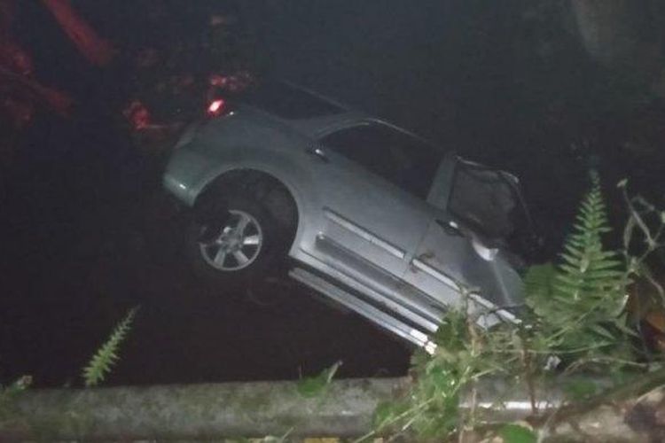 Sebuah Daihatsu Terios terjun ke sebuah parit pada malam hari. Dugaan awal pengemudi mengantuk saat melalui jalan menyerong