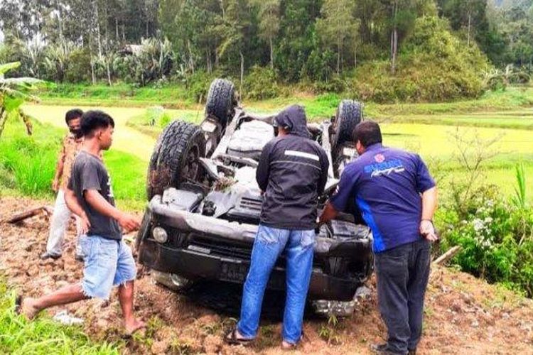 Toyota Fortuner Rekor IAKN Toraja kecelakaan tunggal, posisi telentang di kebun warga KM 10 Minanga, Mengkendek, Tana Toraja
