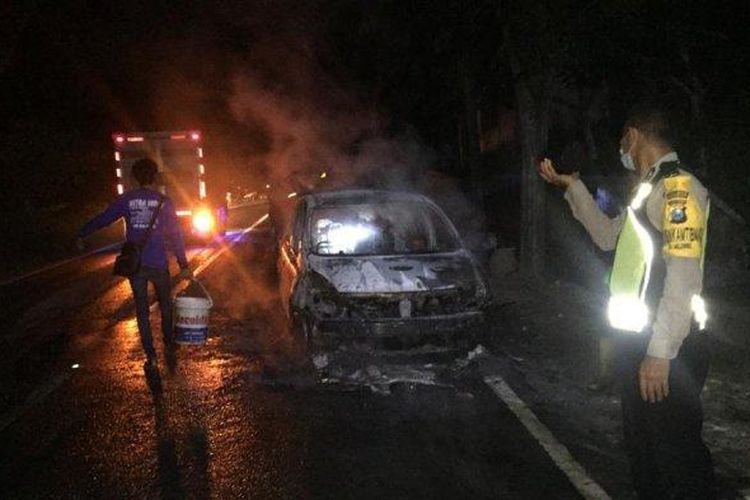 Nissan Grand Livina hangus sia rangka setelah tebakar hebat di jalan raya Ponorogo-Pacitan. Api berawal dari korsleting pada mesin