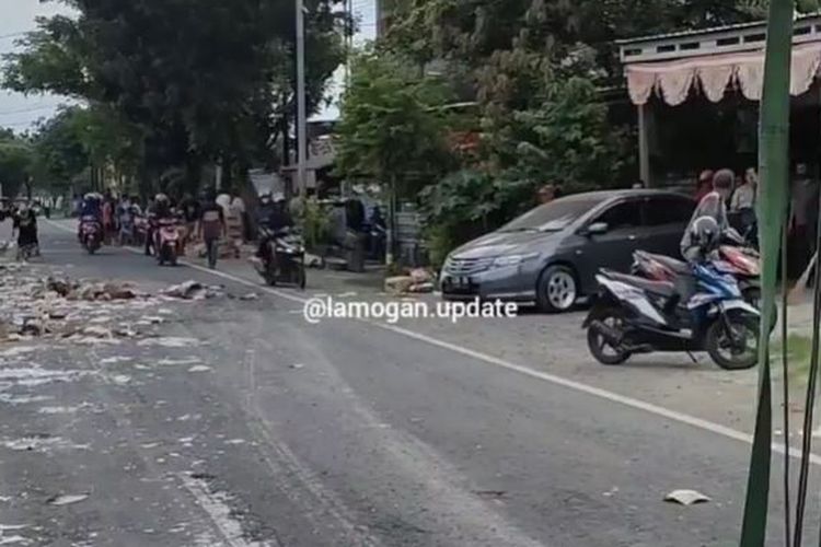 Honda City disambar gandengan truk yang gelimpang di jalan hingga pecahan kaca piring tercecer di jalan raya Lamongan-Babat