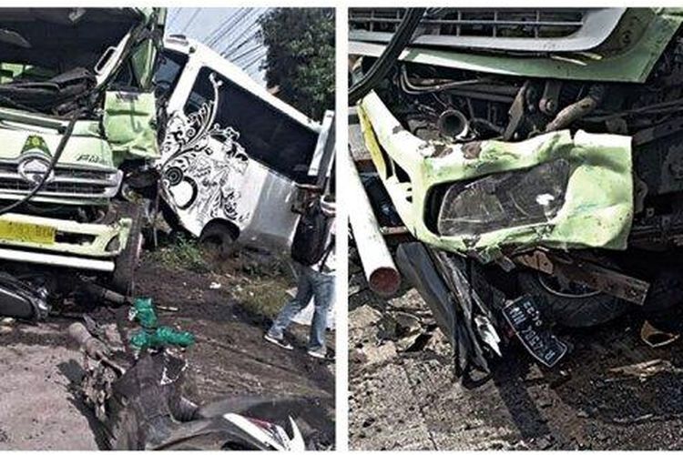 Dua Honda BeAT. Supra X dan sebuh bus rusak setelah diterjang truk muatan batu bara dari belakang. Akibatnya 1 orang tewas