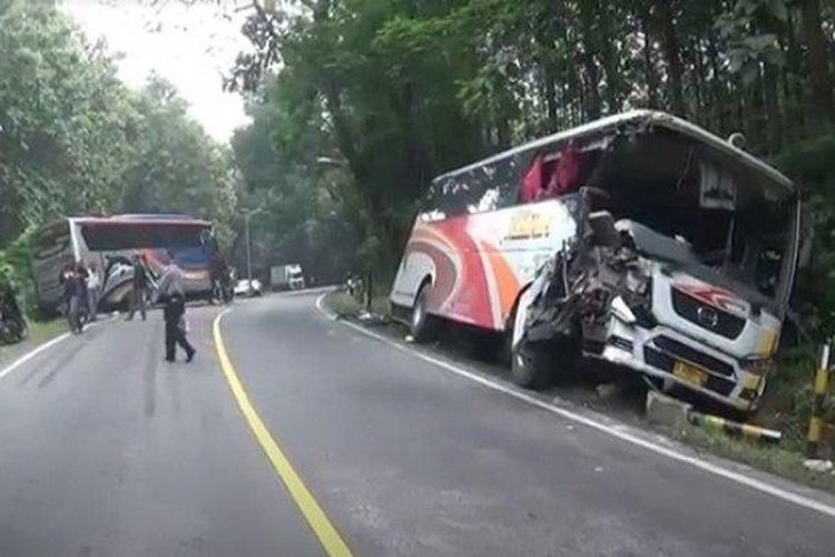 Bus Mira dan Sumber Selamat saling sambar di jalan raya Ngawi-Solo, Kedunggalar, Ngawi, bodi terkoyak parah