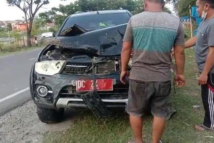 Mitsubishi Pajero Sport Dinas apes ketika melaju di Jl Sultan Hasanuddin, Majene, Sulawei Barat, tabrak kerbau hingga mati