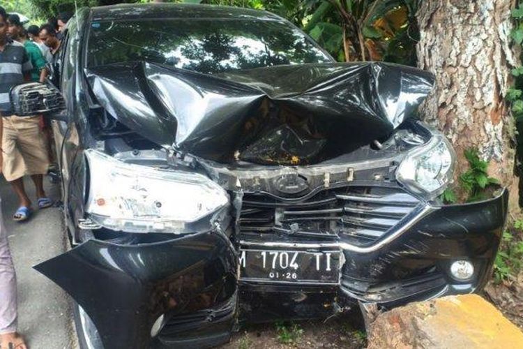 Toyota New Avanza lecek, pelat bodi kanan terkelupas parah diperas truk dari belakang, ruang mesin cekung di Madura