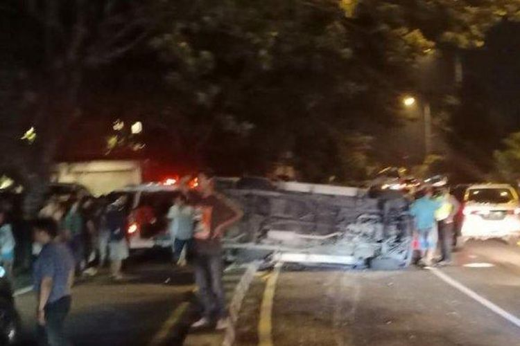 Isuzu Panther gelimpang akibat kesandung pembatas jalan hingga posisinya melintang di tengah jalan Ringroad Selatan, Yogyakarta