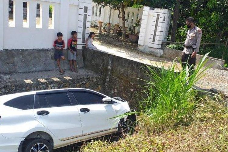 Toyota Calya pesek depan usai nyungsep ke selokan di Bone, Sulawesi Selatan pada hari pertama Puasa Ramadan akibat pengemudi ngantuk