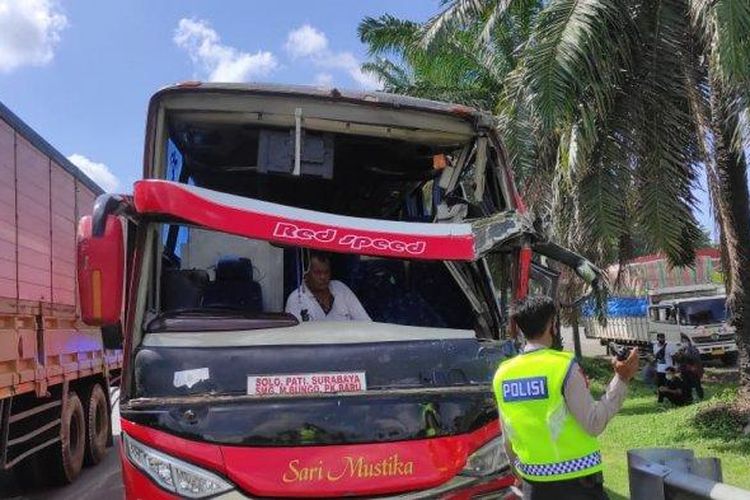 Bus PO Sari Mustika bonyok depan usai sundul truk tangki Pertamina di ruas tol Tangerang-Merak hingga satu penumpang luka