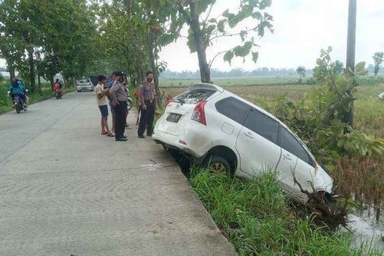 Sebuah Toyota Avanza nyungsep di area persawahan setelah pengemudi memaksa nyetir dalam kondisi mengantuk