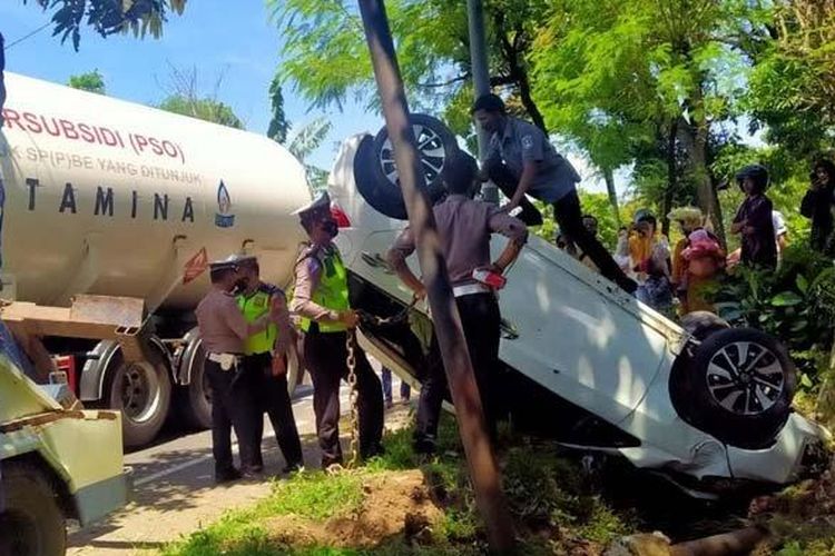 Honda Brio RS jungkir balik usai tusuk Yamaha V-Ixion dari arah berlawanan, kayang hadap langit tepat di antara dua tiang di Jember
