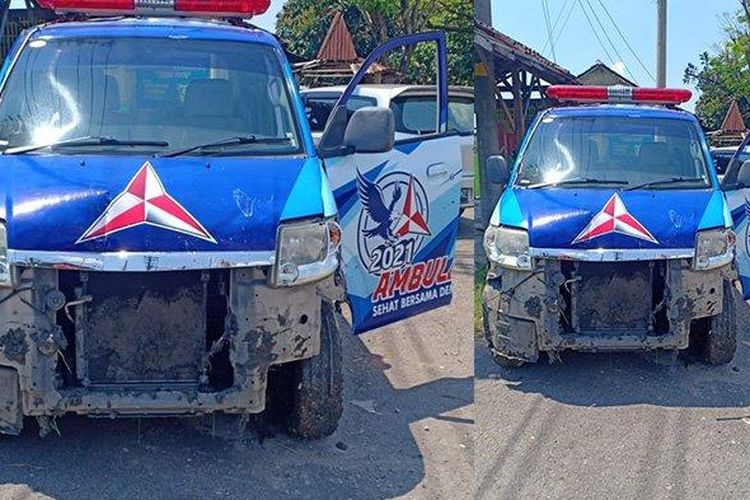Ambulans Partai Demokrat kecelakaan, bumper rontok nyungsep ke sawah, pengemudi lagi belajar nyetir di Sragen