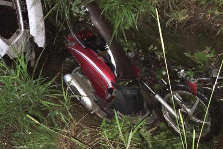 Honda Scoopy patah sasis dan setang dengan posisi terlempar ke got usai adu banteng lawan Datsun GO Panca di Banjarbaru