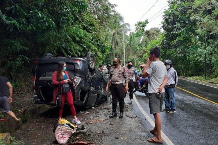 Toyota Avanza yang digunakan calon pasutri untuk berlebaran jungkir balik saat melalui jalan menurun dan menikung