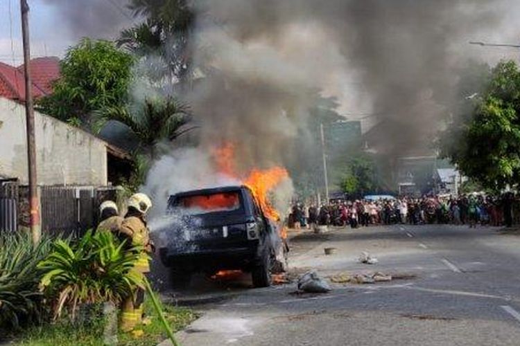 Bensin bocor dari slang tangki ke mesin bikin Range Rover Vogue habis dikeroyok api yang meludeskan mesin dan kabin di Pulogadung