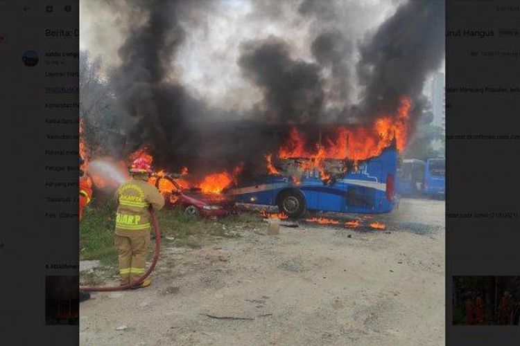 Kebakaran bus Jabodetabek Residence Connexion yang menjalar ke tiga sedan di pool bayangan Kuningan Barat, Mampang Prapatan, Jaksel
