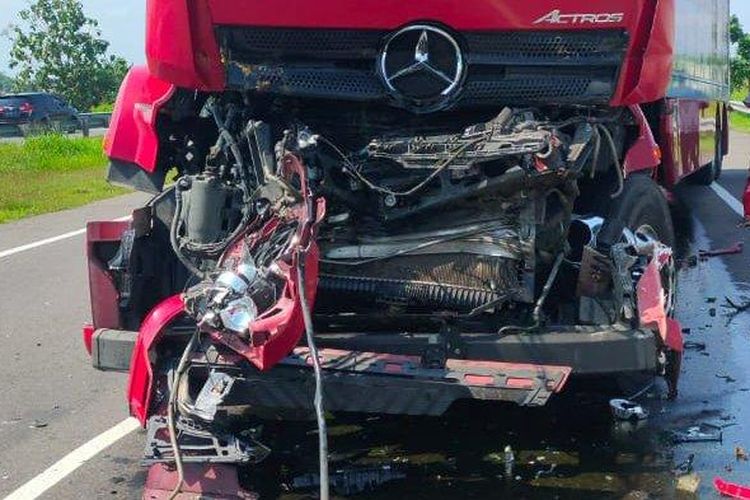 Truk trailer muatan rokok, Mercedes-Benz Actros terburai sabet truk trailer muatan tiang beton di tol Solo-Semarang