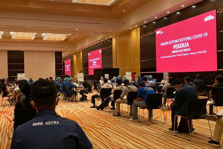 Karyawan BMW Astra mendapat vaksin Covid-19 dalam program Vaksinasi Gotong Royong. Kerja sama Astra International dengan Kimia Farma.
