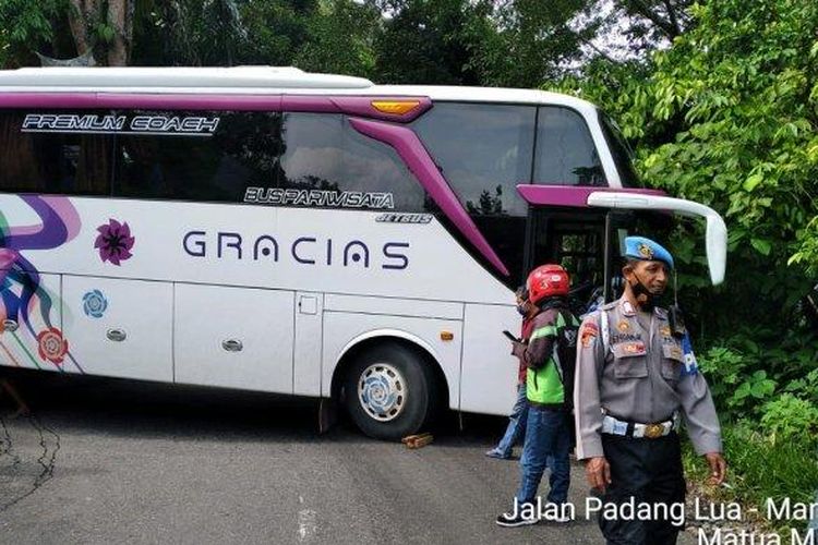 Bus Pariwisata terjepit di tikungan tajam setelah si sopir tak hapal medan jalan dan mengandalkan Google Maps