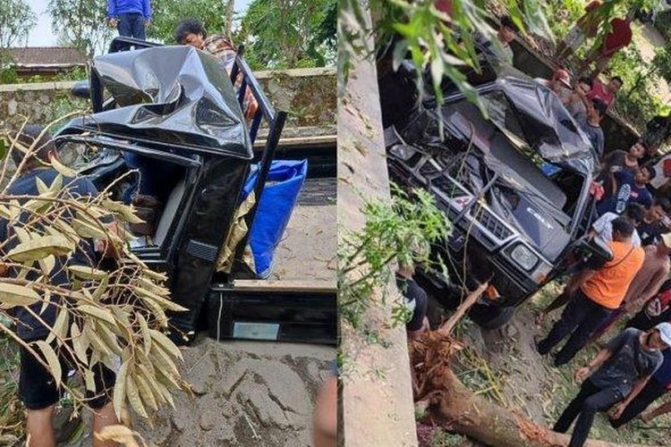 Mitsubishi L300 pikap bonyok wajah setelah menghantam pohon durian di pinggir jalan. Kakak dan adik langsung dievakuasi ke rumah sakit