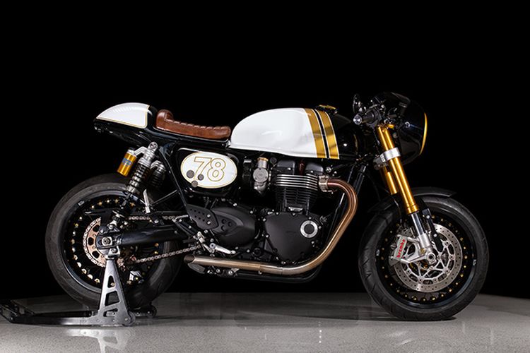 Begini gaya Triumph Thruxton 1200 R yang diaubah menjadi cafe racer dengan ubahan menawan. Kaki-kaki gede, perpaduan warna menarik