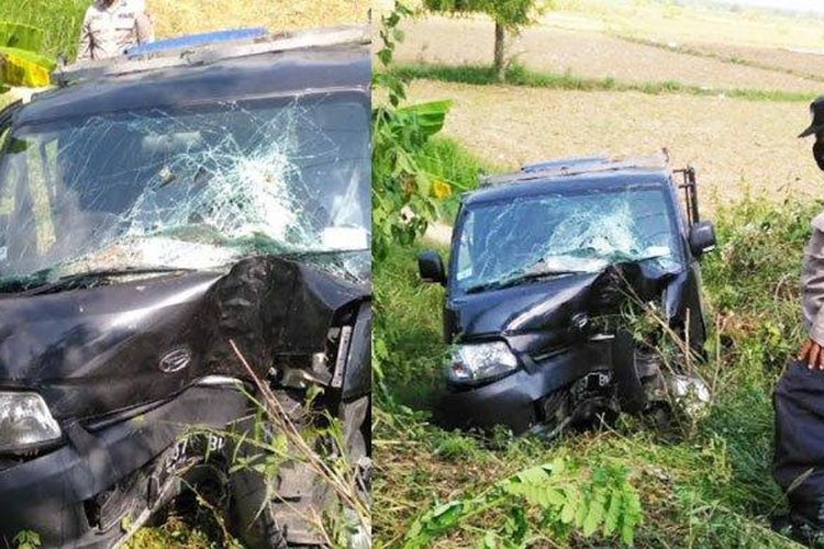 Kecelakaan tunggal Daihatsu Gran Max pikap hantam pohon dan terpental ke sawah di Sampang, Madura, sasis dan bodi cekung