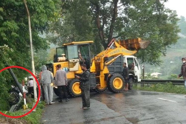 Daihatsu Taruna terjungkal ke dalam selokan di Tawangmangu, Karanganyar di tikungan Watu Sambang akibat botol susu jatuh