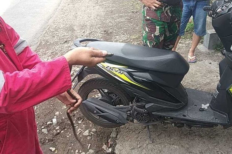 Ular bandotan macan tiba-tiba muncul dari rongga bodi Honda BeAT usai dibawa belanja ke swalayan di kota Malang