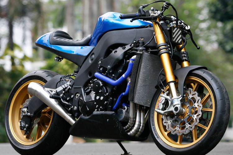 Kawasaki ZX-10R yang bergenre superbike dibikin trondol dan sasis asli dilepas, kemudian dibikin ulang agar berpenampilan cafe racer