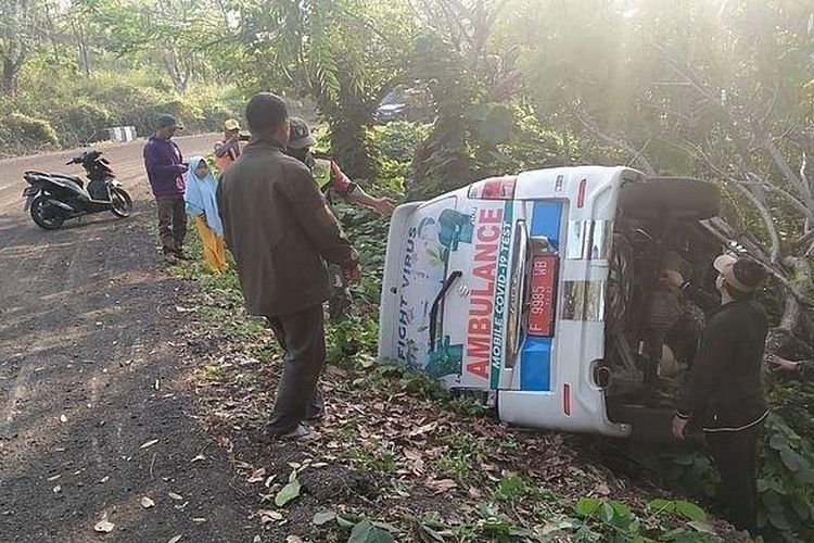 Ambulans Puskesmas Agrabinta terguling ke dalam kebun karet di Cianjur diduga karena pengemudi mengantuk usai antar pulang pasien