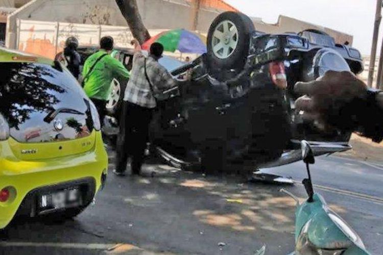 Suzuki Grand Escudo gagal menyalip diadang truk, banting setir ke kiri senggol Geely Panda hingga mental dan kayang di kota Malang