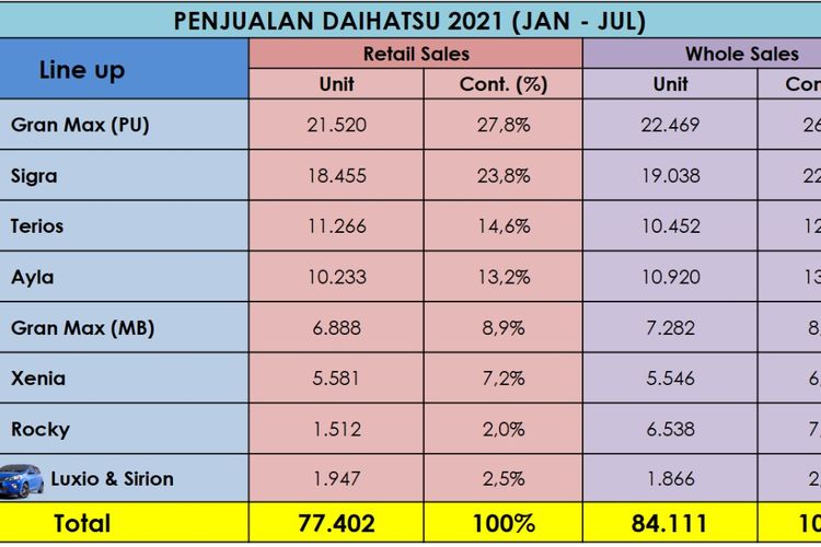 Daihatsu mencatatkan penjualan retail sebesar 77.402 unit pada Januari-Juli 2021, naik 30,2% dibanding periode yang sama tahun lalu