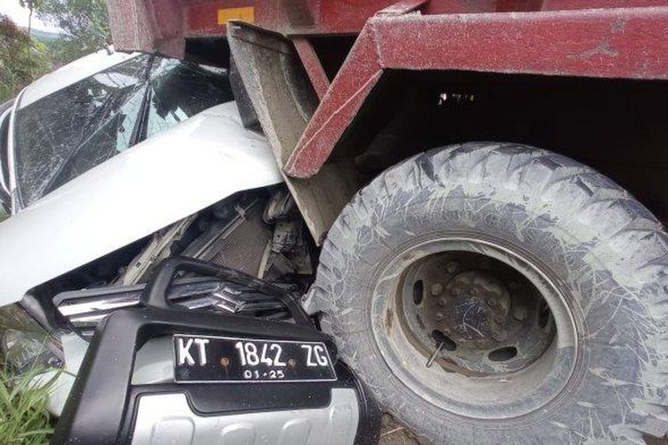 Sebuah Suzuki Ertiga ringsek usai kena terjang truk yang tidak kuat menanjak. Bumper dan kap mesin sampai berantakan