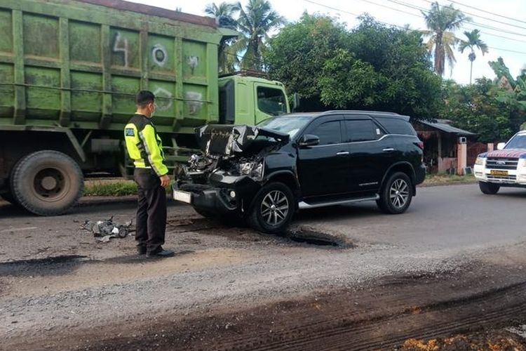 Toyota Fortuner yang ditumpangi Bupati Merangin, Mashuri mencancap di bak truk batu bara hingga terkelupas di Batang Hari