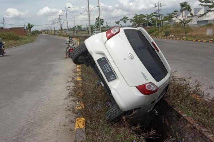 Daihatsu Ayla yang ditumpangi satu keluarga nungging di selokan gara-gara istri yang baru belajar mengemudi panik