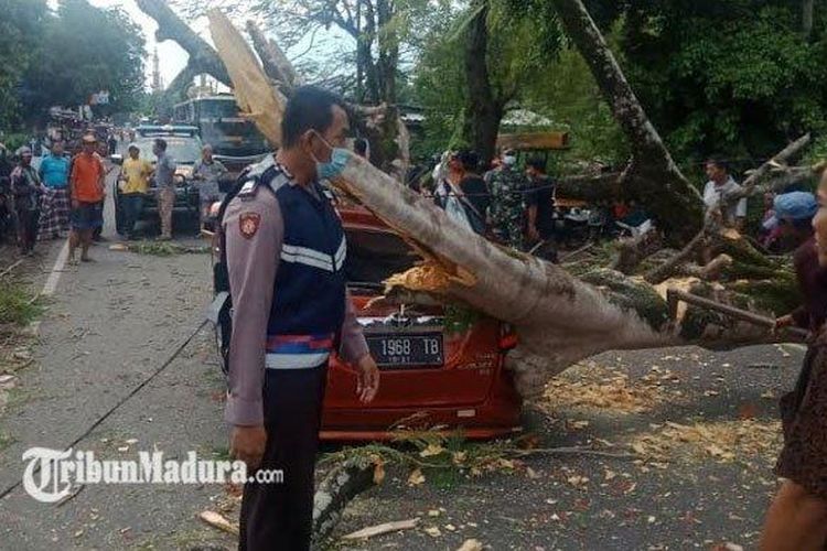Pohon tumbang di desa Tanah Merah, Bangkalan, Madura menimpa Toyota Calya yang melintas, satu penumpang robek kepala dan retak rahang gigi