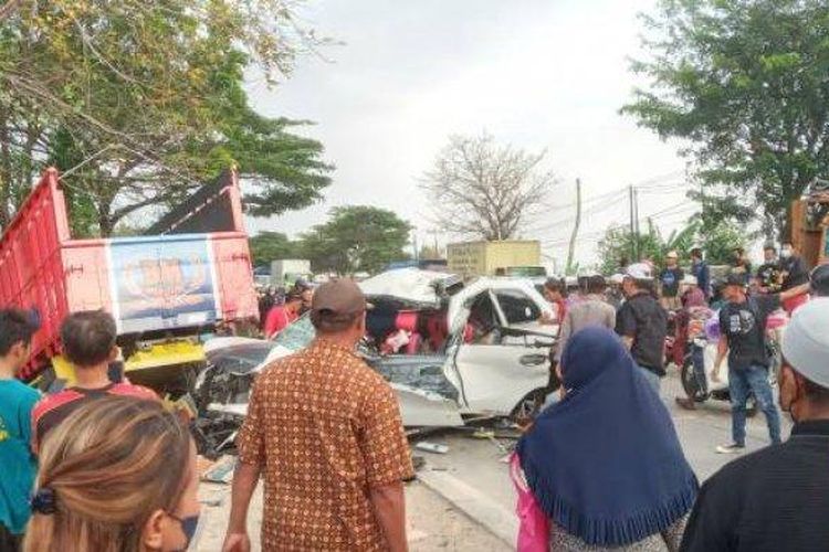Toyota Avanza hancur lebur tak berbentuk di jalur Pantura Indramayu akibat tabrak truk parkir di bahu jalan